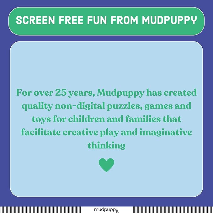 - MUDPUPPY - For over 25 years, Mudpuppy has created quality non-digital puzzles, games and toys for children and families that facilitate creative play and imaginative thinking. One of our core design principles is to engage kids and promote learning without the use of digital screens or technology. Mudpuppy is committed to designing and producing eco-friendly products that have a minimal carbon footprint. All Mudpuppy products adhere to CPSIA, ASTM, and CE Safety Regulations