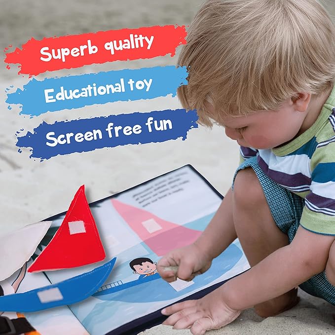 - PLAY AND LEARN – This Montessori book has 6 activity pages and 1 plush toy for your child to learn and practice real life situations like unzipping, button or recognizing the shapes . Enhance their motor fine skills. This book will give them tons of fun and educational activities, while you can have quiet time for yourself.