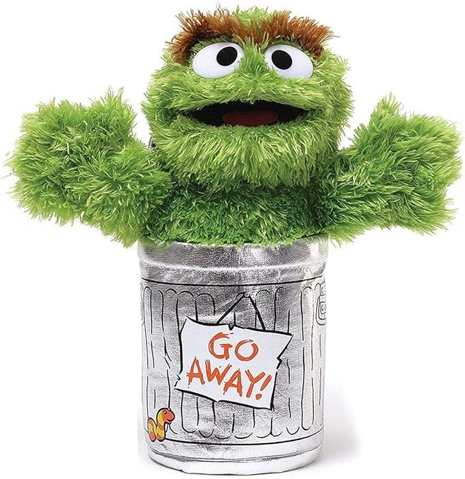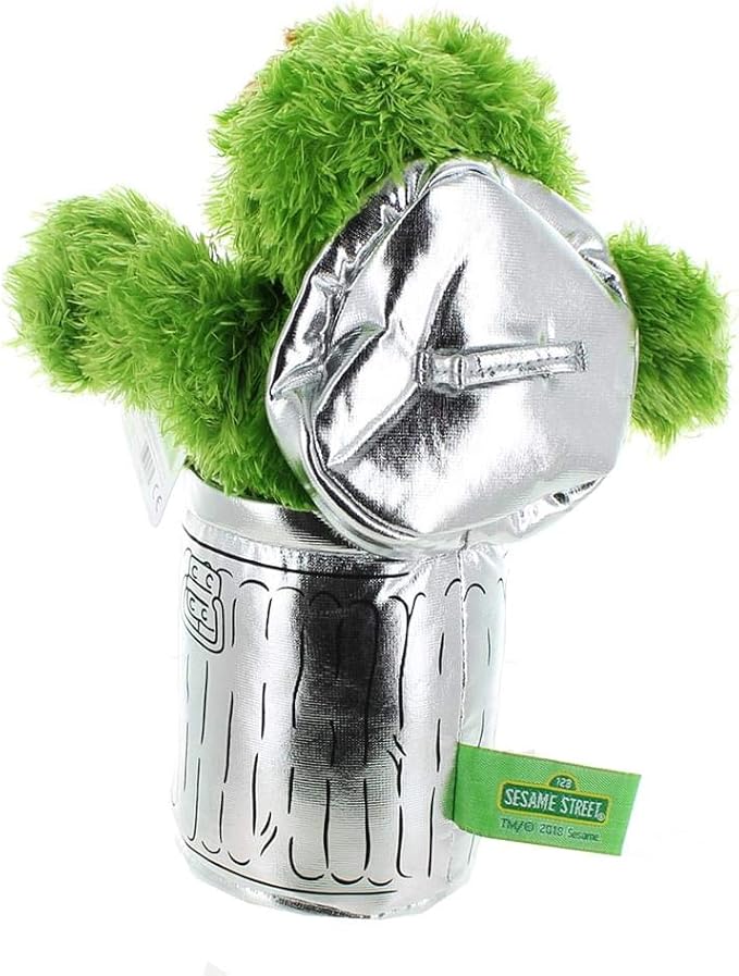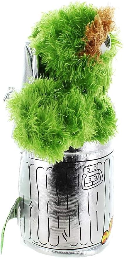 - SESAME STREET OSCAR PLUSH: This adorable 10” plush features Oscar the Grouch in his silver trash can home with arms outstretched ready for a hug. Oscar features soft, shaggy green plush, bushy brown eyebrows, and his trash can has a “Go away” sign.