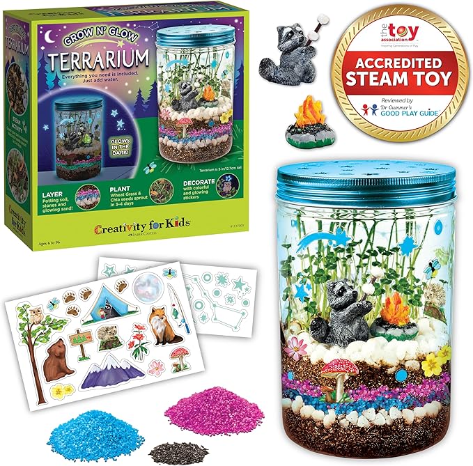 - TERRARIUM KIT FOR KIDS: Discover the wonder of nature and science with the Creativity for Kids Grow 'N Glow Terrarium! This kids science kit is fun and engaging. This STEM project for kids ages 6-8+ allows you to craft, plant, water, and grow your own mini ecosystem. Just add water to discover a unique educational science experience!