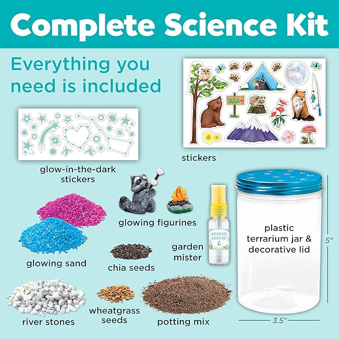 - EDUCATIONAL SCIENCE KITS: Includes everything a young botanist needs to plant and grow their terrarium twice! The complete science and arts and crafts kit for kids ages 6+ features a plastic terrarium jar, potting mix (vermiculite), plenty of quick-growing organic chia and wheatgrass seeds, glow-in-the-dark forest figurines, and more!