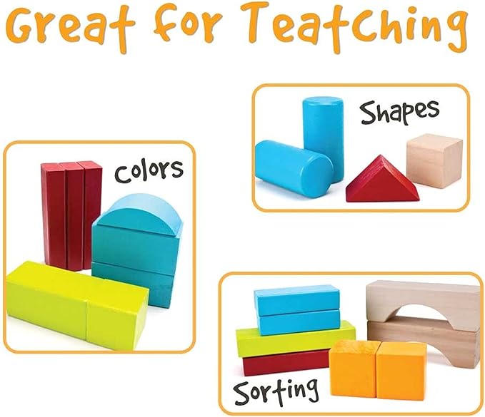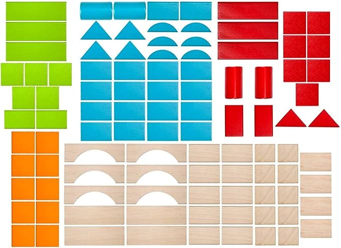 - 100 Piece Megapack: Use your imagination with stacking blocks. Includes 100 wooden blocks in 5 bright colors and 9 fun shapes