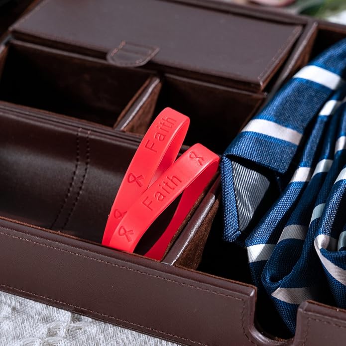 - STRONG SILICONE BAND: This silicone bracelet is made to fit comfortably while not restricting blood flow. Our red awareness bracelet is made of high quality non-toxic, eco-friendly 100% silicone. These awareness bracelets are adult size, measuring 8 1/4 inches in circumference and reads "Hope, Faith, Love" on the outside.