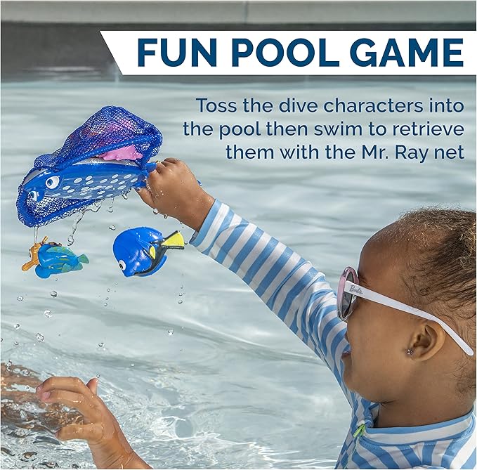 - FUN POOL GAME: Toss the dive characters into the pool then swim to retrieve them with the Mr. Ray net - each character floats at different depths, adding to the fun of catching the characters