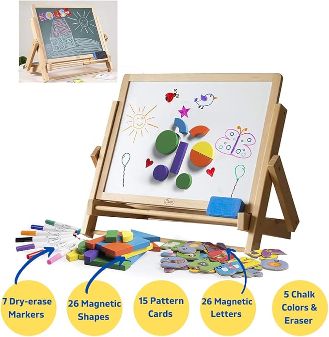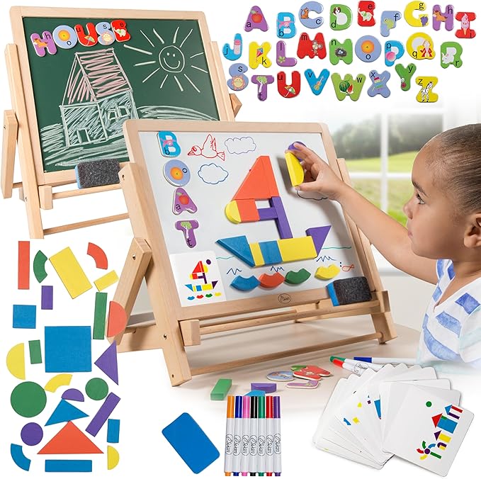 Wooden Double-Sided Tabletop Magnetic Dry Erase & Chalkboard Easel- 80 pc Activity Set for Kids Includes Magnet Letters, Shapes, Patterns, Chalk and 7 Dry Erase Markers- STEM Boys & Girls Play Center