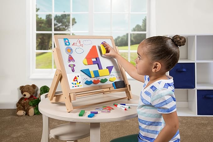 Wooden Double-Sided Tabletop Magnetic Dry Erase & Chalkboard Easel- 80 pc Activity Set for Kids Includes Magnet Letters, Shapes, Patterns, Chalk and 7 Dry Erase Markers- STEM Boys & Girls Play Center