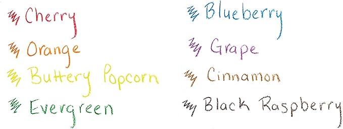 - Includes: Cherry, Orange, Buttery Popcorn, Evergreen, Blueberry, Grape, Cinnamon and Black Raspberry scented pencils; Safe for children over 3 years of age
