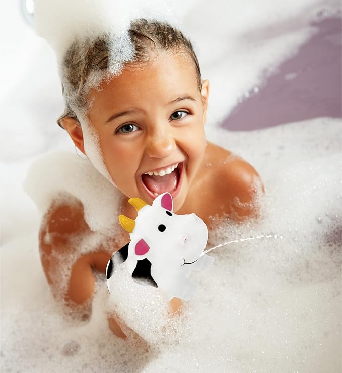 - INCLUDED WITH THE PURCHASE OF COW BATH TOY FOR KIDS - Includes 1 DolliBu White Cow Squirter Bath Toy for Kids. This bath cow toy features smooth, soft, and rounded edges to ensure the children's safety when bathing. Designed with realistic features of a cow animal farm toy, like its black spots. The adorable smiling cow figure bath toy shoots out water from a tiny hole when squeezed. This cool cow water toy measures 3.25Lx2.5Wx2.5H inches.