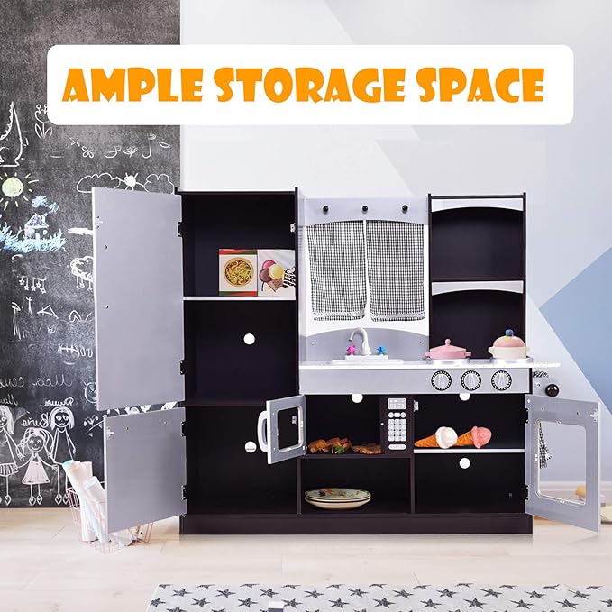 • 【Large Storage Space】Open the door under the sink and stove to storage as many food as possible. Besides, there is also the space aside the microwave to hold added food or cookware, which can exercise children’s classification and organization ability. With so much storage space, kids won't mess up the kitchen playset during the entertainment.