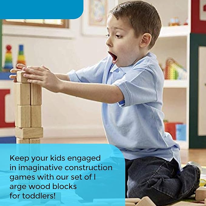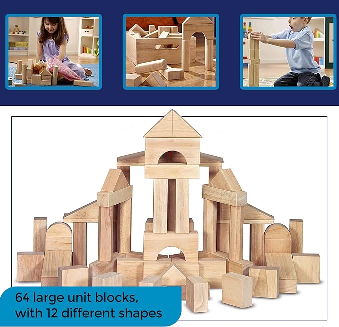- Wooden Building Blocks Set: Keep your kids engaged in imaginative construction games with our set of large wood blocks for toddlers! This toy set includes 64 large unit blocks; with 12 different shapes inside for kids to build different configurations.