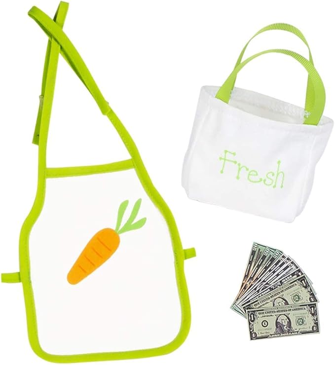 - 31-Piece Set that includes wooden pieces of farmer’s market stand, 2 crates, 2 tomatoes, 2 apples, 3 oranges, 3 bananas, 3 carrots, 4 paper signs, 9 paper money, green apron with a carrot on the front and a grocery bag with Fresh written on the front