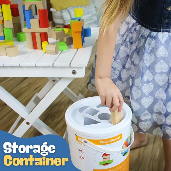 Pidoko Kids Wooden Blocks - 100 Pcs - Building Blocks for Toddlers - Includes Storage Container with Shape Sorter Top - Hardwood Plain & Colored Wood Blocks - Preschool Block Learning Toys