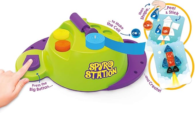 - FUN & INNOVATIVE KIDS ARTS AND CRAFTS: Spyro Station – Motorized coiling station with easy to use size guide is designed to make it easy peezy for even a 5-year-old to explore the endless possibilities of paper quilling (operates on 3 AA batteries, batteries not included)