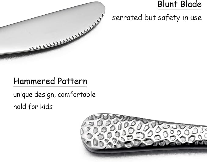 - SAFE FOR KIDS - Smooth edges without rough spot to hurt child's lips or skin, Butter knife with blunt blade suitable for toddlers to practice and adapt to real silverware