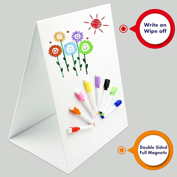 - Easy to Use: Double sided self-standing desktop Easel, folds flat for easy storage, save space and fast assemble. Magnetic surface makes it easy access for any magnetic letters, numbers or other teaching aids.
