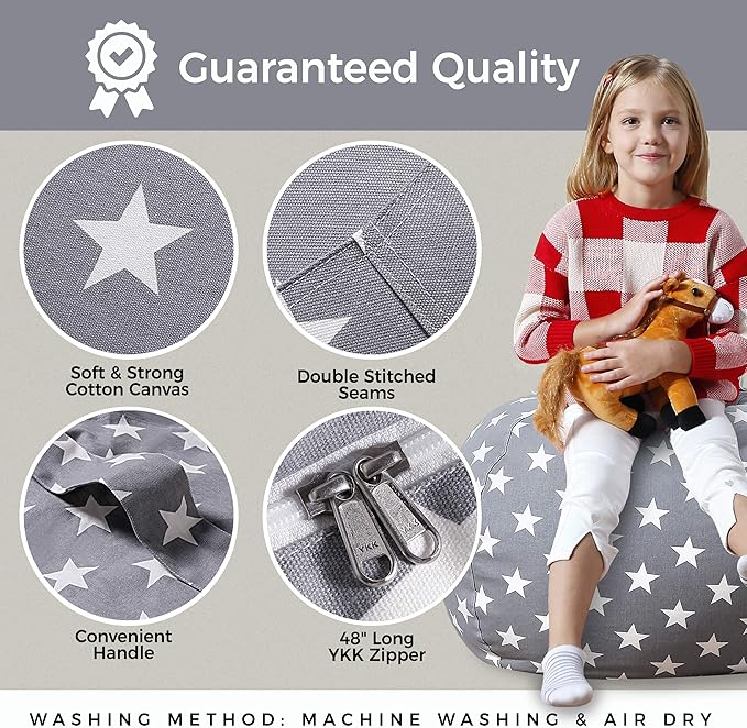 Aubliss Stuffed Animal Bean Bag Storage Chair, Beanbag Covers Only for Organizing Plush Toys, Turns into Bean Bag Seat for Kids When Filled, Medium 32"-Canvas Stars Grey