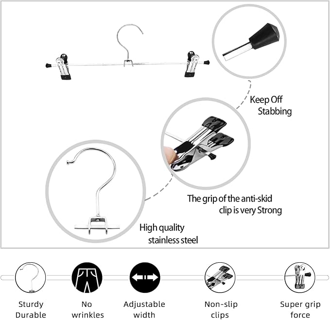 - [Clip hangers Adjustable] - Pants Hangers with clips has 2 adjustable clips, suitable for different sizes of your clothes. You can hang them up very conveniently, whether it’s children’s or adult pants.