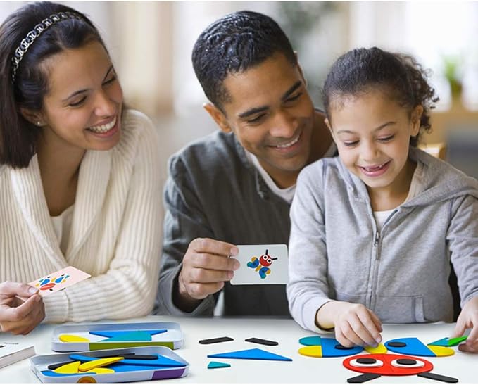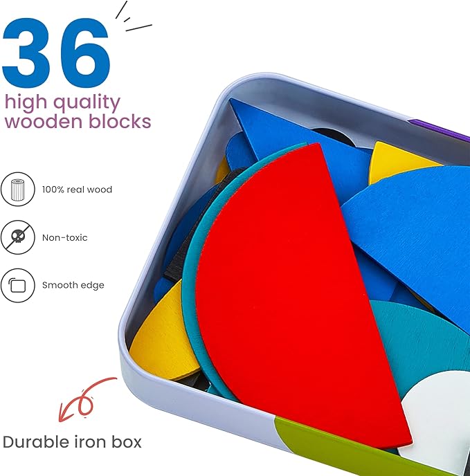 - Contains 36 wooden shape pieces, 60 pattern cards and 2 iron tins for storing the pieces