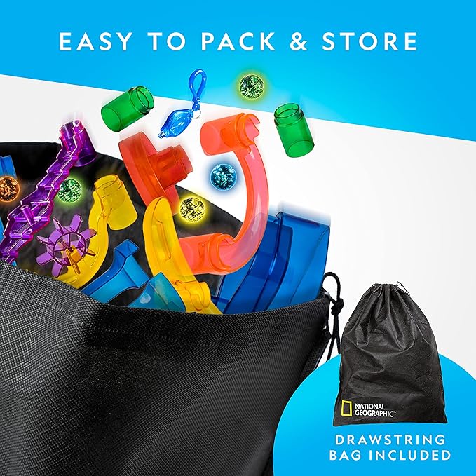 NATIONAL GEOGRAPHIC Glowing Marble Run – Construction Set with 15 Glow in The Dark Glass Marbles & Storage Bag, STEM Gifts for Boys and Girls, Building Project Toy (Amazon Exclusive)