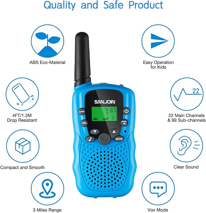 - Long Rang Coverage : SANJOIN kids warlike talkies contains 22 main channels & 99 sub-channels, ensuring 3 mile wireless talkback. Open a world of possibilities within your child's outdoor adventures!