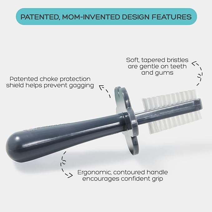 - SOFT BRISTLES & CHOKE PROTECTION: Our patented baby toothbrush ensures a mess-free cleaning experience. With a choke barrier, it prevents over-insertion and gagging. Soft bristles are gentle on tender gums and new baby teeth. A must-have for your 1-year-old's dental care kit, perfect for toddlers transitioning from finger toothbrushes.