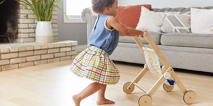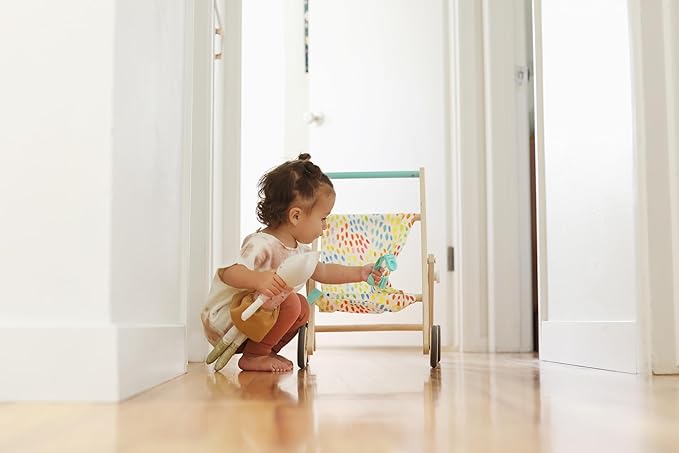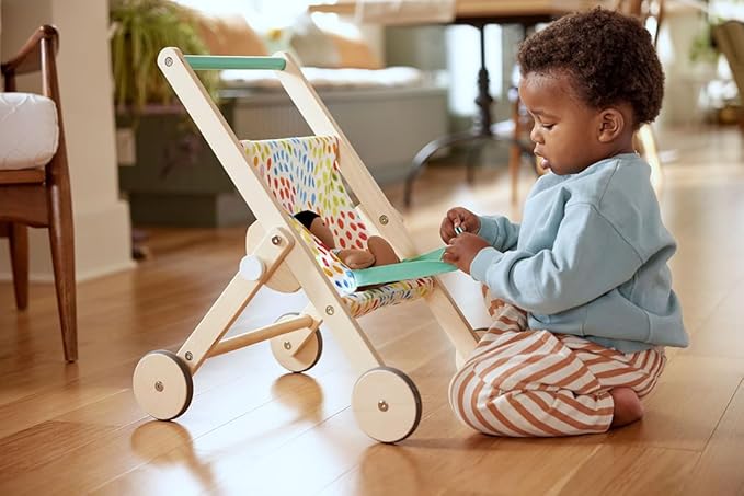 - Perfect for little walkers: Made with sustainably forested wood and cheery organic cotton, the Buddy Stroller is balanced for easy playing, and built at the perfect height for your toddler’s arms and hands