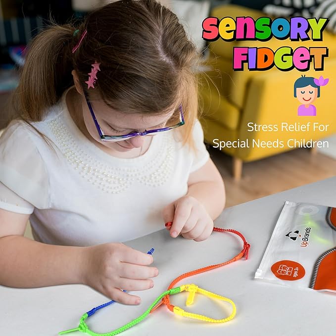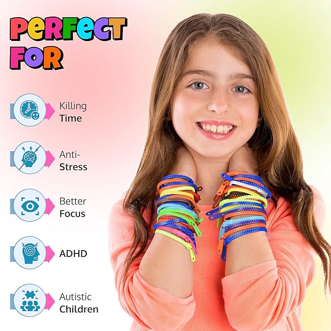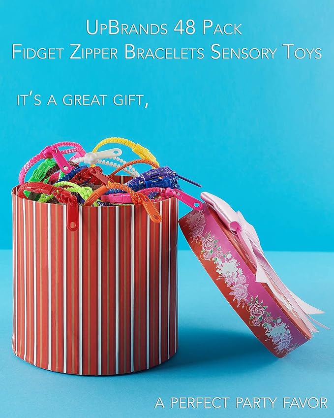 - UpBrands 48 Pack Fidget Zipper Bracelets Sensory Toys - an excellent kit for birthday party favors for kids. They are a very popular party favor hot toys for your child's Birthday party. Children will play with these plastic bracelets fidget jewelry and will love to share them in goody bag stuffers. Great Sensory Figit Stress Relief Toys for Special Needs Children. Perfect for killing time, anti-stress, better focus, ADHD, or autistic children.
