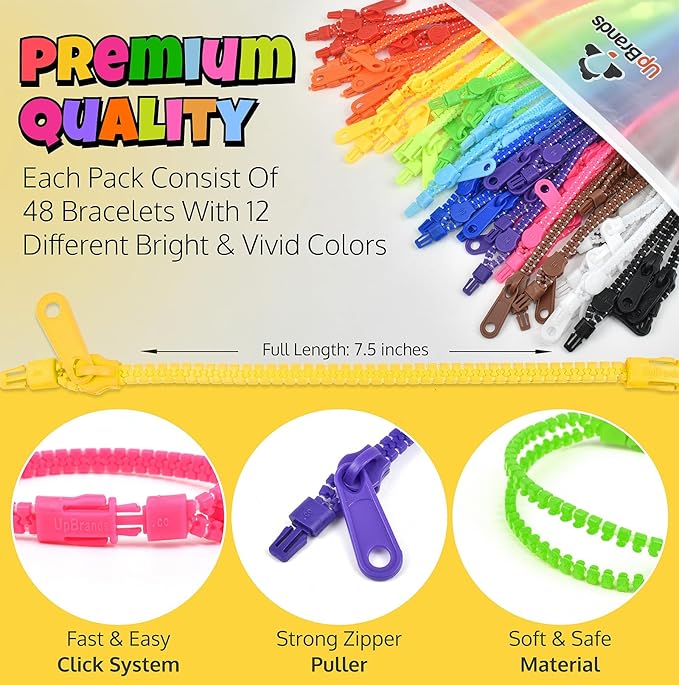 - Every zipper bracelet measures 7.5 inches, which is long enough even for adults. Bracelets are packed in a highly resistant zipper bag. UpBrands Fidget Zipper Bracelets 48 Pack comes in a wide variety of bright and vivid colors.