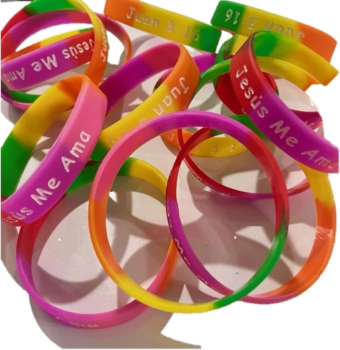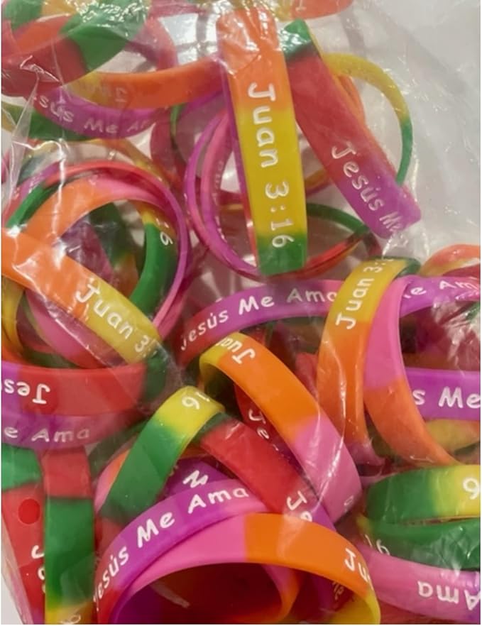 - 100-count pack of Jesus loves me, Jesus Me Ama, Juan 3:16 Christian silicone rubber bracelets. Christian silicone rubber bracelets are great for mission trips and gifts for the Spanish.