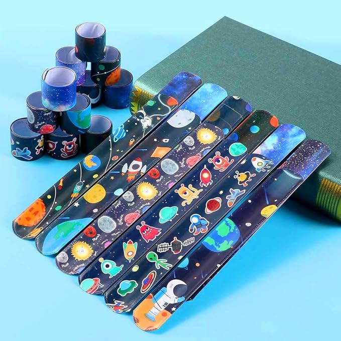 - Includes: This assorted space party favor slap bracelets includes 48 slap bracelets. It contains 12 different pattern designs (4 of each) of space slap bracelets. Original Design Pattern. Registered Copyright. Manufacturer recommended age:3 years and up