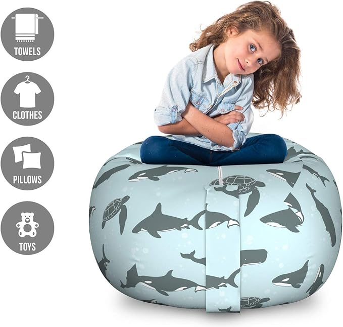 Lunarable Orca Storage Toy Bag Chair, Continuous Pattern of Whale Shark and Turtle Bubbles Aquatic Animals, Stuffed Animal Organizer Washable Bag, Large Size, Blue Grey