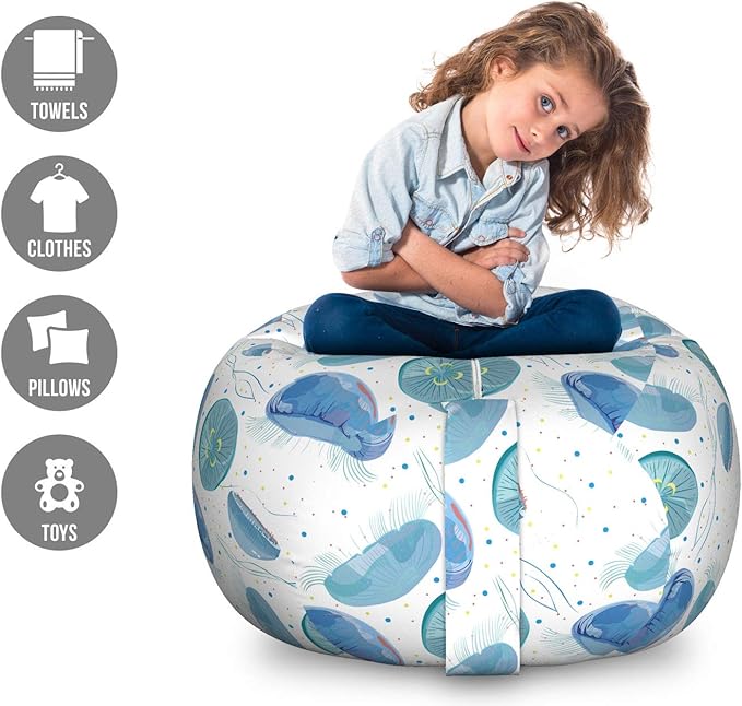 Lunarable Nautical Storage Toy Bag Chair, Jellyfish Pattern with Spotted Background Ocean Creatures Ornamental Sea Life, Stuffed Animal Organizer Washable Bag, Large Size, Pale Blue
