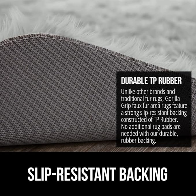 - SLIP RESISTANT RUBBER BACKING: unlike other brands and real fur rugs, Gorilla Grip faux fur rugs feature a slip resistant backing constructed with durable, long-lasting TP Rubber; no additional rug pads are needed with this rug