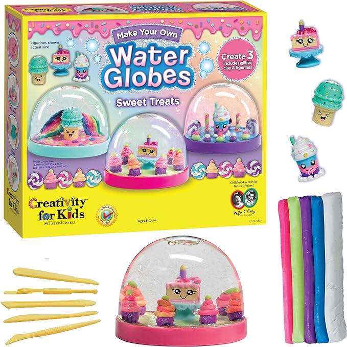 • 3 SWEET TREAT SNOW GLOBES: Making a dessert-themed snow globe is easy with vibrant colored non-drying clay! This complete arts & crafts kit for kids includes sparkly glitter, stickers, and sweet figurines provided in this DIY snow globe kit. Give the snow globes as a handmade gift or display them in your room!