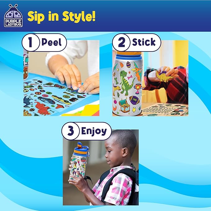 - Ready to decorate! Everything you need included to create a personalized water bottle comes in this kids craft kit! There are so many unique stickers, you will have leftovers to put wherever you like! The six sheets of stickers with designs measure 6.25" x 7.75". Sticker themes include dinosaurs, cars, sports, letters, sayings, planets, and many more!