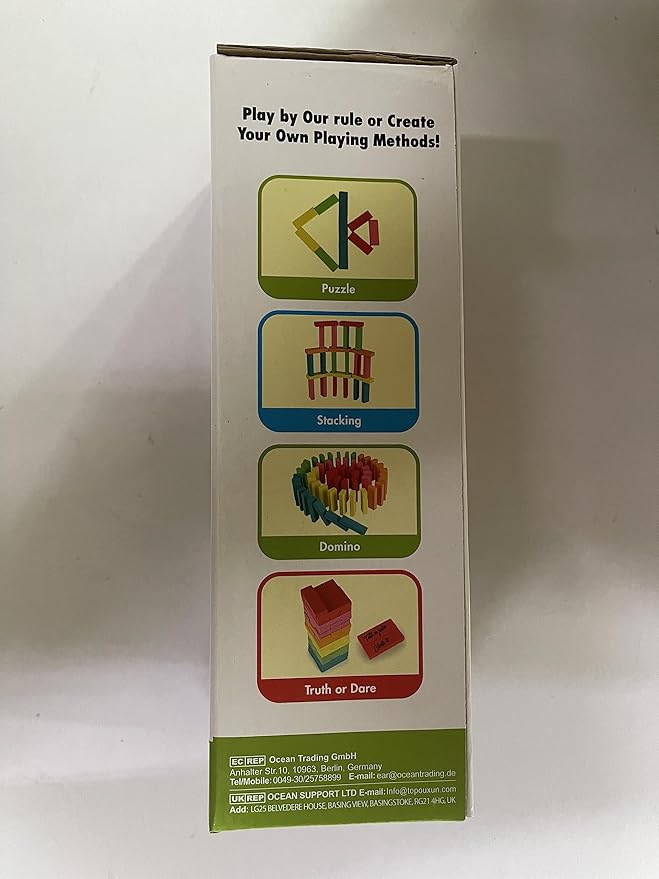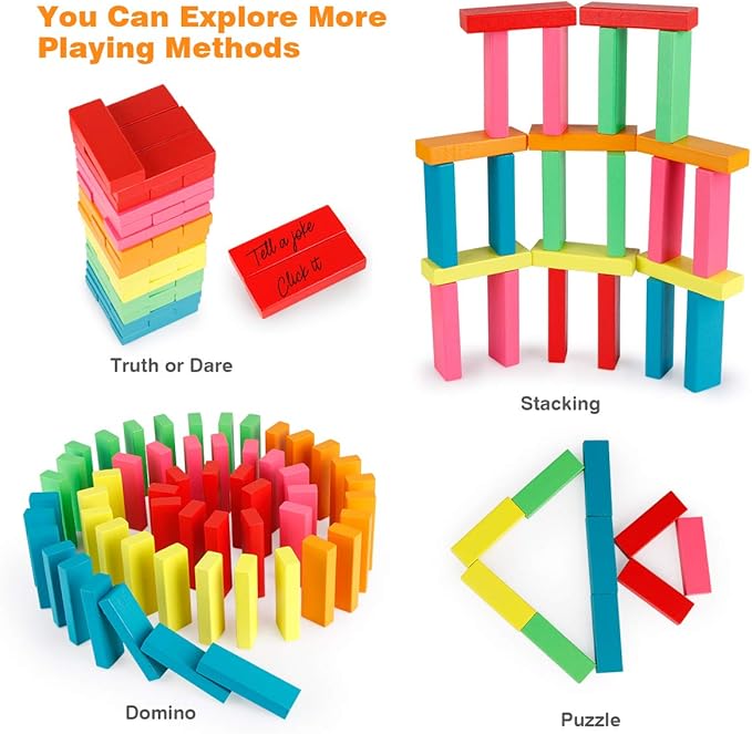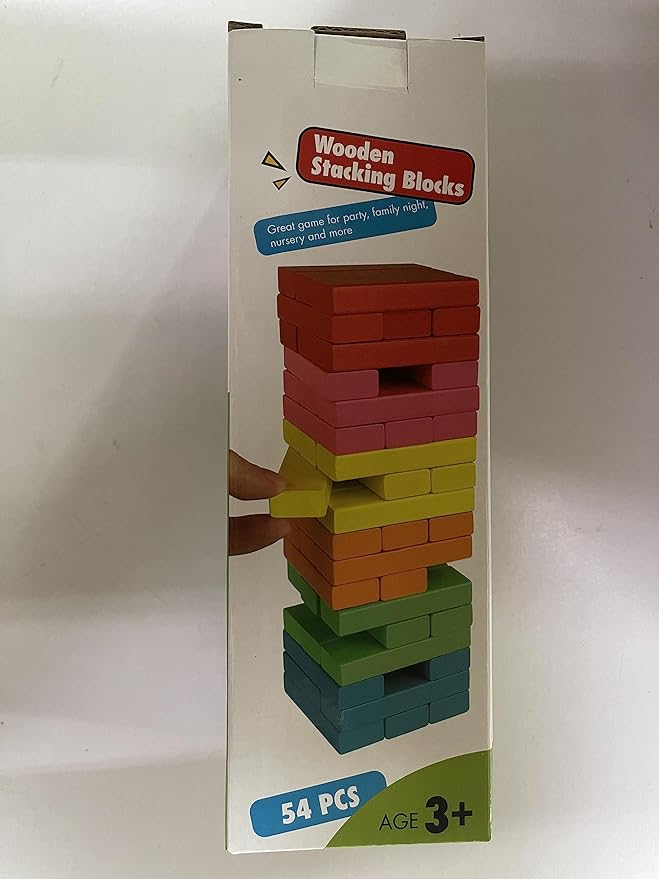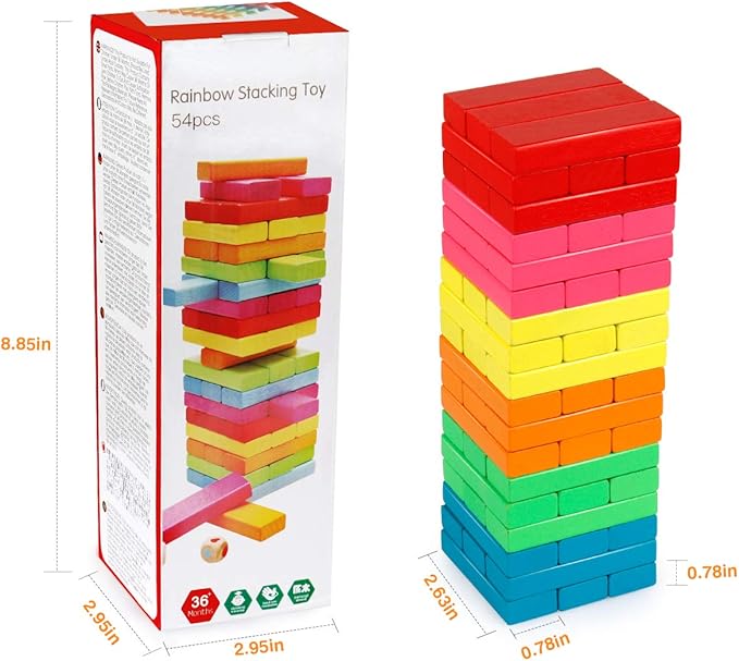 - Wooden Stacking Blocks Game: The colorful tumbling stacking blocks game includes 54 colorful wooden blocks, two dice, and one storage bag. Size of single piece: 2.95 x 0.6 x 0.98 inches. Recommend for ages three and up.