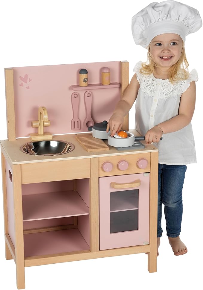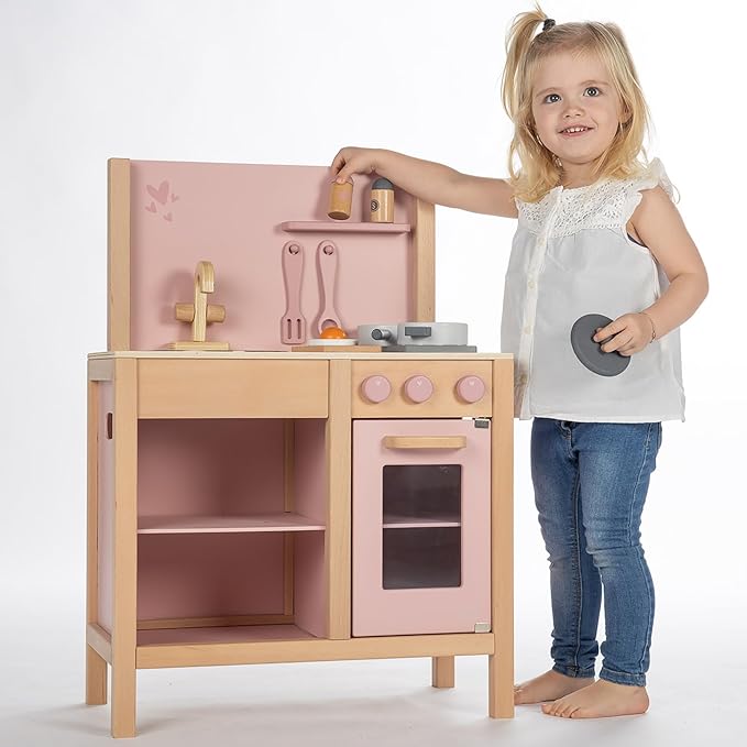 Wooden Kitchen Play Set - Pink - Standing Appliance Toy, Cooking & Food Accessories, Storage-Oven-Sink, Pretend Play Station, Kids Age 3+