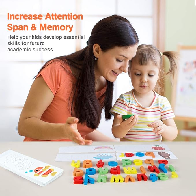 - Excellent Sight Word Vocabulary Learning: wooden spelling words game, matching letters puzzle contains 28 double-sided activity flashcards, 52 wooden lowercase letters. Like other coogam puzzles, there is a sturdy cover for the section that holds the letters. Kids can read what each card says because the picture next to it as a reinforcement helps.