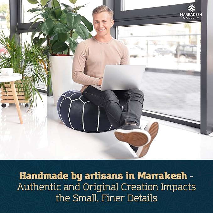- Handcrafted by Artisans in Marrakesh - Made from 100% genuine soft leather, this Round Leather Cover pouf ottoman features exquisitely detailed, hand-stitched embroidery with a unique design down to the finest details