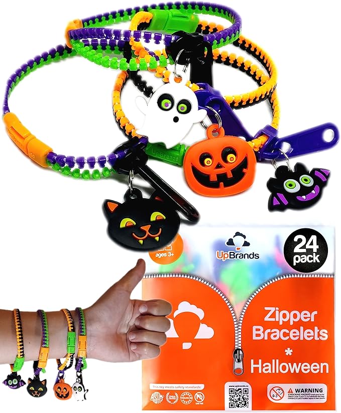 - UpBrands Halloween Zipper Bracelets – 24 Pack: These fun and colorful zipper bracelets are perfect for adding excitement to Halloween goodie bags and non-candy trick-or-treat toys. UpBrands' bracelets are adored by children and create a thrilling sensory experience, making any party or celebration a hit!