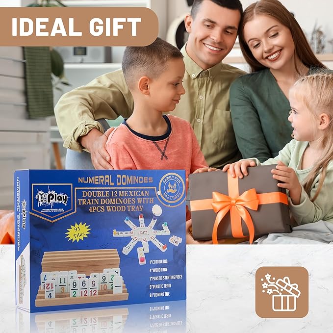 Mexican Train Dominoes Set with Numbers - Double 12 Colored Number Dominoes - Includes 91 Tiles with 9 Trains, 4 Wooden Trays and Storage Bag for 2-8 Players Ages 8+