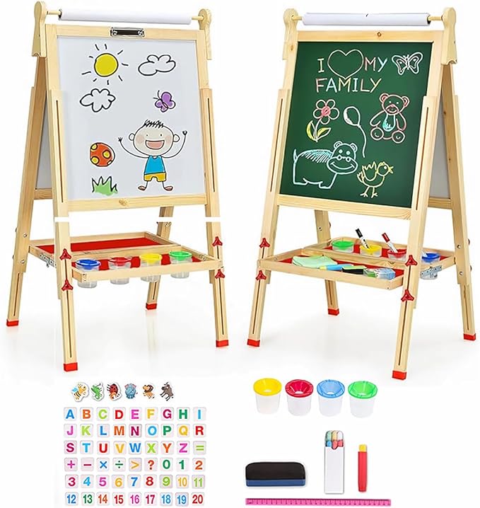 EAQ Easel for Kid,Height Adjustable Wooden Art Easel,Whiteboard Chalkboard with Paper Roll Holder,Letters and Numbers Magnets and Other Accessories Best Birthday Gift for Kids