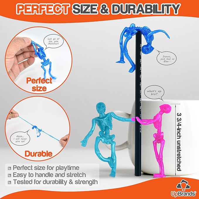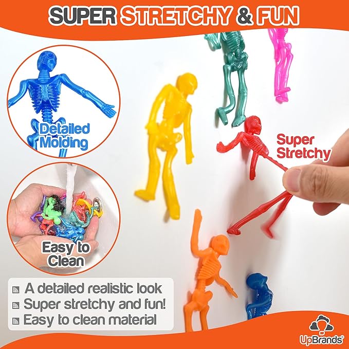 - UpBrands Stretchy Skeletons 120 pack - an excellent kit for birthday party favors for kids. Children will play with these stretchy sticky toys and will love to share them in goody bag stuffers. They are perfect even for Halloween Trick or Treat bags. A must-have, along with all the fidget zipper bracelets, sticky hands, stretchy lizards, candy, cupcakes, and novelty toys in candy bags. Be the talk of the school and neighborhood with these Stretchy Skeletons.