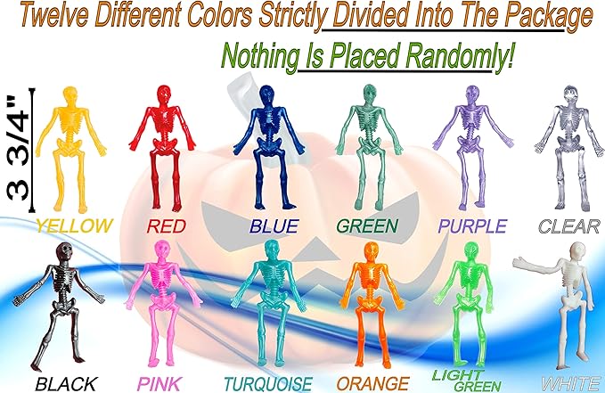 - Every skeleton measures 3 3/4 inches and stretches up to 24 inches (2 feet). Skeletons have well-defined shapes. Each bendable skeleton toy is individually wrapped, and all are packed in a highly resistant zipper bag. Each wrap contains a safety warning, so these stretchy rubber toys can be well used as piñata, Easter egg, goodie bags, or Halloween treat bags fillers.