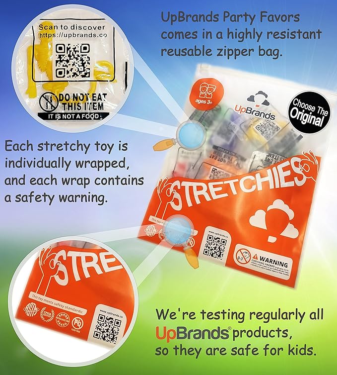 - UpBrands Stretchy Skeletons 72 pack - an excellent kit for birthday party favors for kids. Children will play with these stretchy sticky toys and will love to share them in goody bag stuffers. They are perfect even for Halloween Trick or Treat bags. A must-have, along with all the fidget zipper bracelets, sticky hands, stretchy lizards, candy, cupcakes, and novelty toys in candy bags. Be the talk of the school and neighborhood with these Stretchy Skeletons.