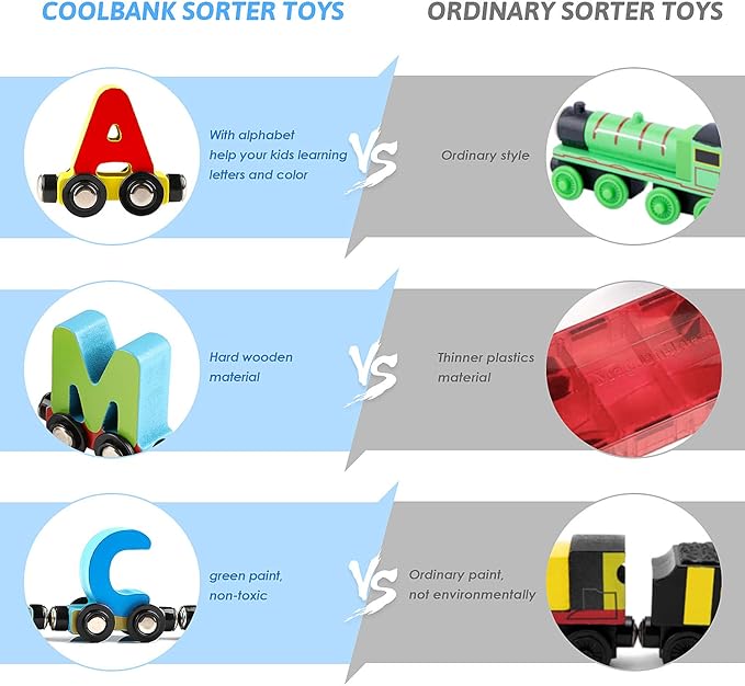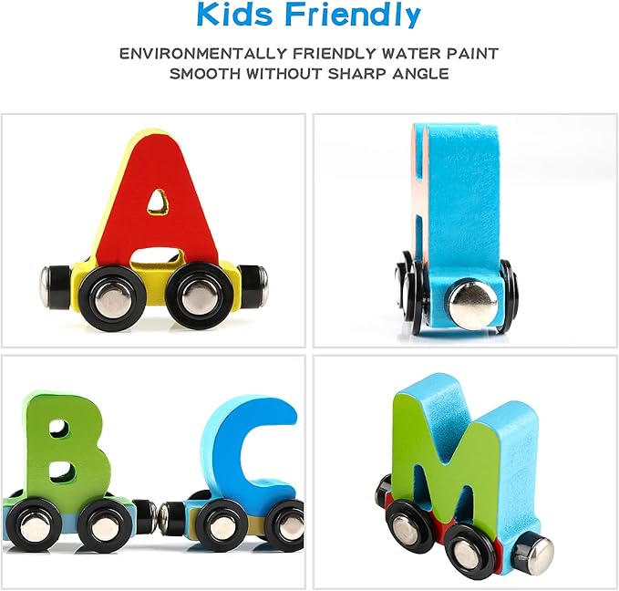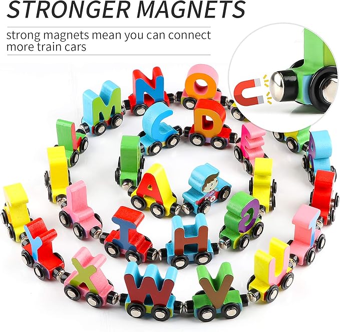 • Stronger Magnet: The magnets on our alphabet trains were carefully chosen and have been tested extensively to be stronger than those in other sets. This means more train cars can be connected together to make longer trains. 27 pcs wooden alphabet train compatible with other track toys