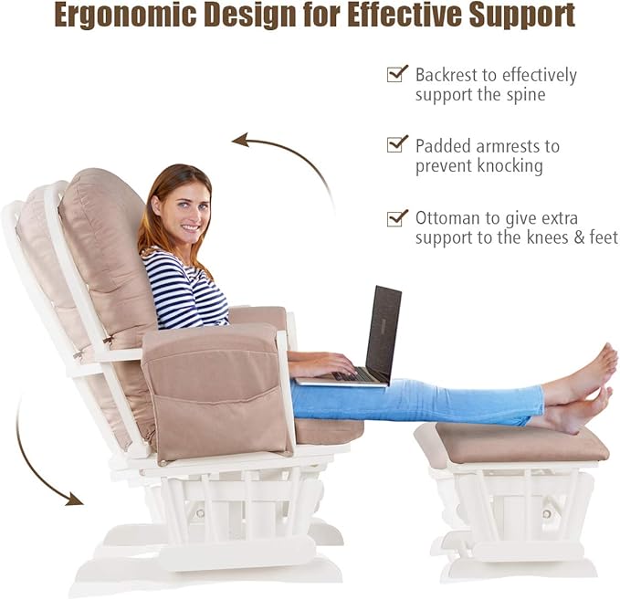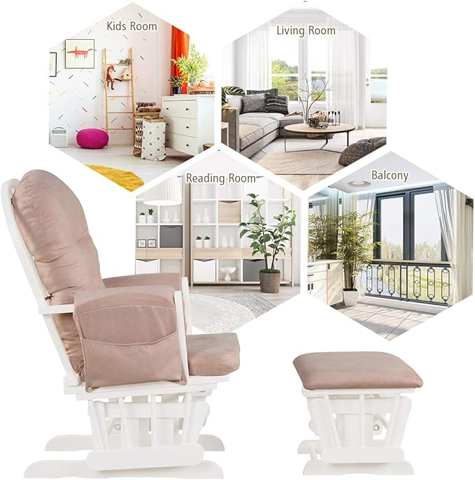 - [Multifunctional Glider & Ottoman Set] This glider and ottoman set can be used not only during pregnancy and nursing. It can also be used as a regular rocking chair or a comfortable spot to relax, read, or watch TV. It can be placed in the living room or bedroom, serving as a comfortable seating option for anyone in the family. A variety of colors are available to match the overall aesthetic of the room.