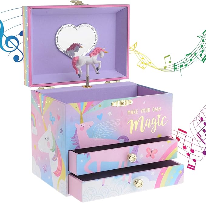 - Charming Storage Solution: Delight your little one with this unicorn-themed girls jewelry box, featuring a spinning unicorn figurine and ample space to organize necklaces, bracelets and earrings