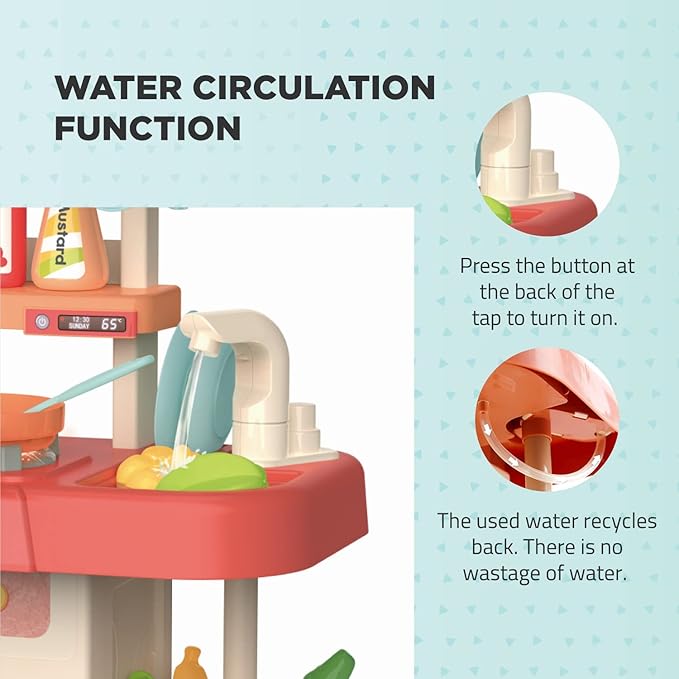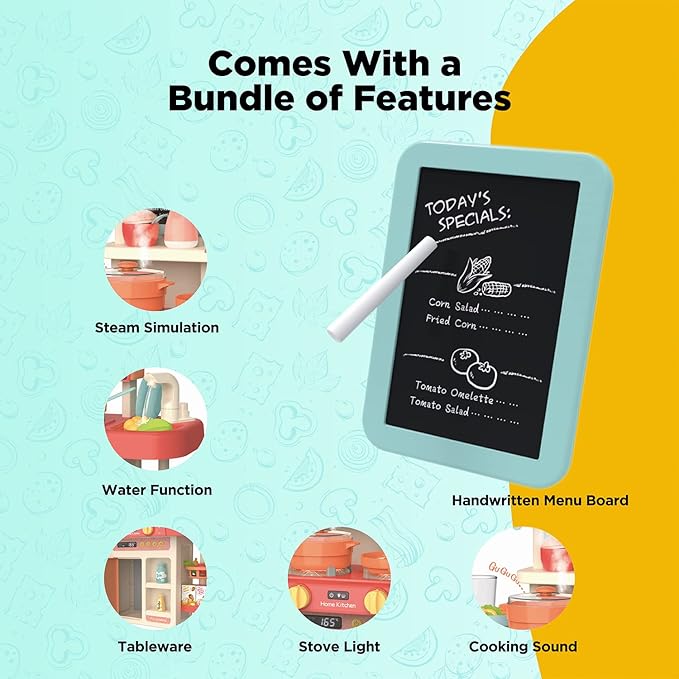 Kitchen Play Set with Accessories- Mini Kitchen Set with Realistic Light Sound Steam Simulation- Indoor Games Cooking Playset with Water Outlet- Toys for Toddlers Children & Girls