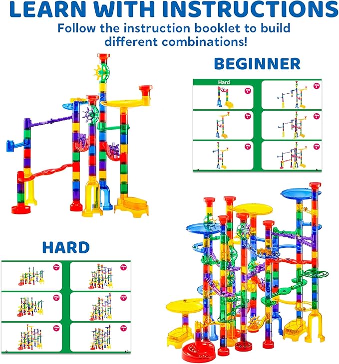 - This STEM marble run set comes with an assembly instruction to help kids’ hand-eye coordination. After they learned, they will have ability to build any different tracks by their imagination and logical mind. Perfect Toy Set to develop kids’ creativity, logical thinking, hand-eye coordination. Play and Gain patient and problem-solving ability. Excellent Gifts for all kids